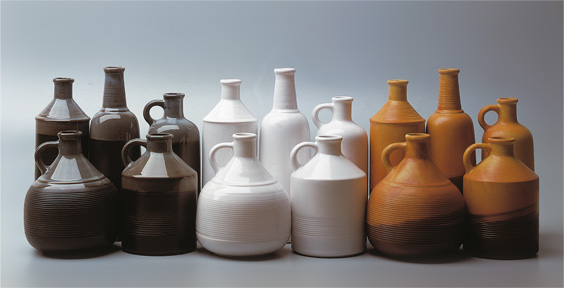 Questa serie di cinque elementi consente diverse soluzioni. Le bottiglie e le fiasche, infatti, possono essere impiegate come vasi per fiori, come contenitori per liquori fatti in casa, come deposito dell’olio e dell’aceto. Un gruppo di bottiglie, inoltre, può avere semplicemente una funzione decorativa. Franco Bucci scelse queste bottiglie per sperimentare diversi tipi di decori: dal graffito sullo stampo di gesso, al graffito sull’ggetto in terra, passando poi alle decorazioni a decalcomania e alle infinite prove di colore e di smaltatura.